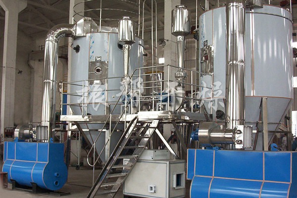 空气经过过滤和加热,进入干燥器顶部空气分配器,热空气呈螺旋状均匀地进入干燥室。料液经塔体顶部的高速离心雾化器,(旋转)喷雾成极细微的雾状液珠,与热空气并流接触,在极短的时间内可干燥为成品。成品连续地由干燥塔底部和旋风分离器中输出,废气由风机排空。
