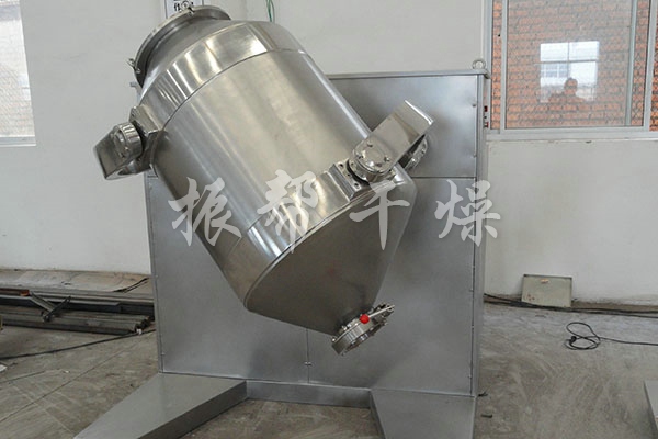 装料的筒体在主动轴的带动下,作周而复始的平移、转动和翻滚等复合运动,促使物料沿着筒体作三向复台运动,从而实现多种物料的互相流动、扩散、积聚、掺杂.以达到均匀混合的目的。