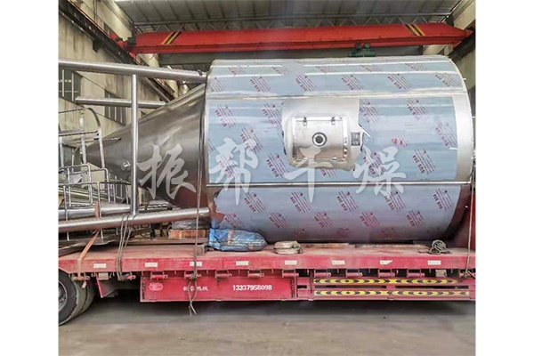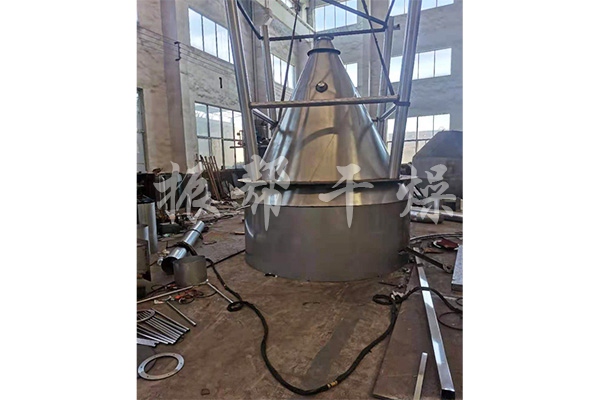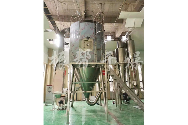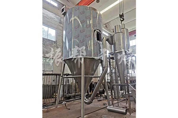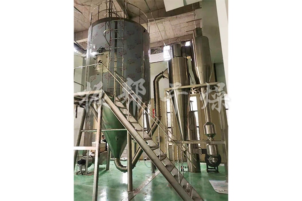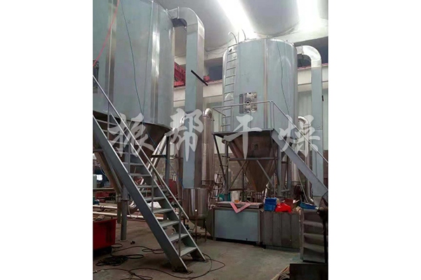 空气经过过滤和加热,进入干燥器顶部空气分配器,热空气呈螺旋状均匀地进入干燥室。料液经塔体顶部的高速离心雾化器,(旋转)喷雾成极细微的雾状液珠,与热空气并流接触,在极短的时间内可干燥为成品。成品连续地由干燥塔底部和旋风分离器中输出,废气由风机排空。